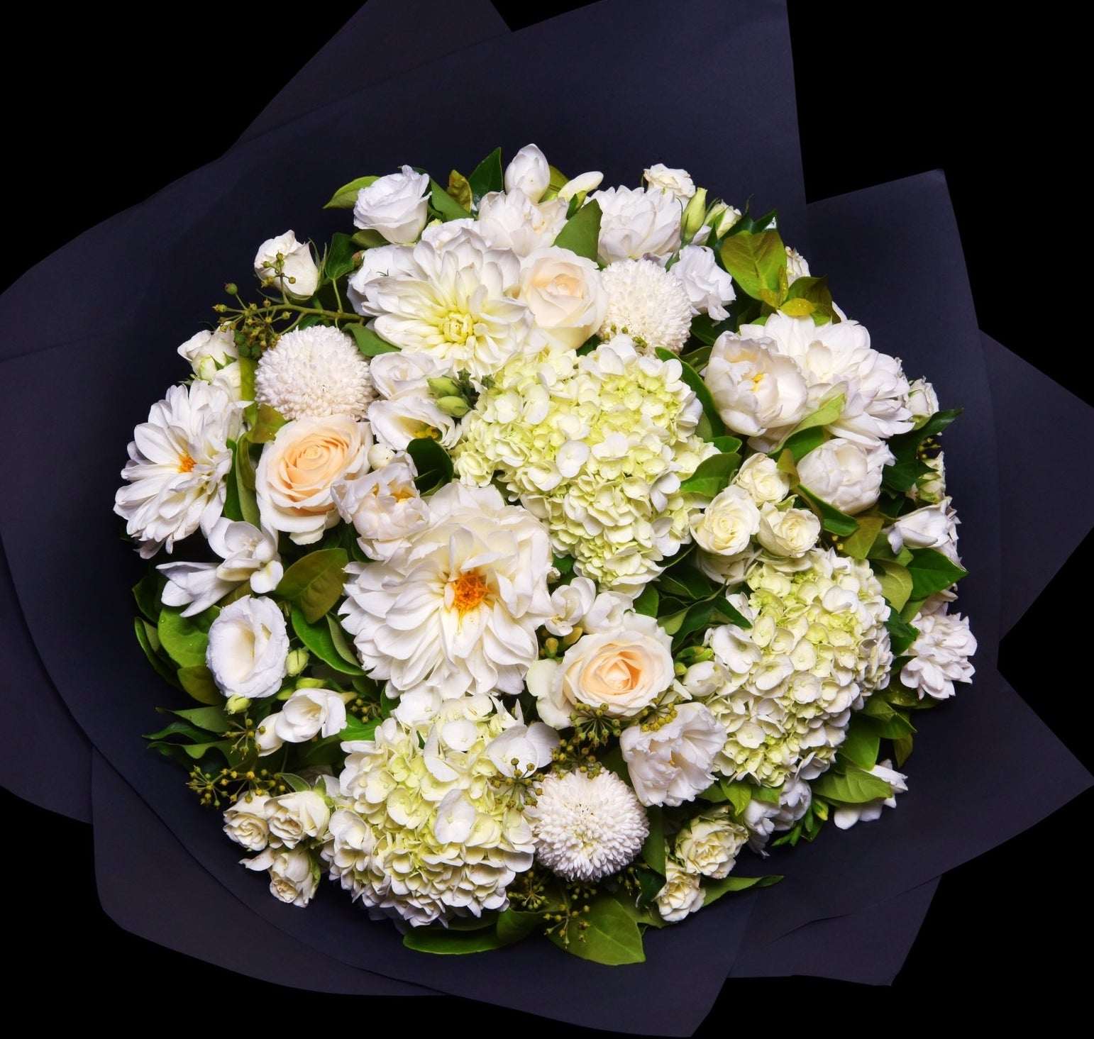 Angelic is a classic selection of premium blooms constructed as a hand-tied bouquet, presented in our signature wrap and finished with our printed Maison Fleur ribbon.
