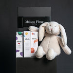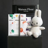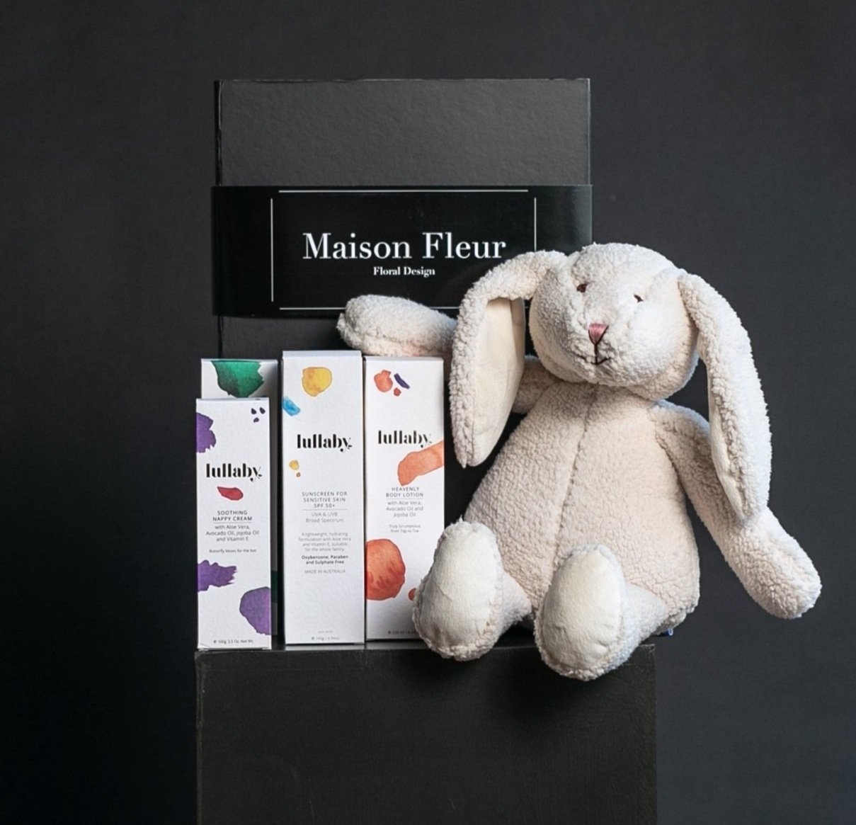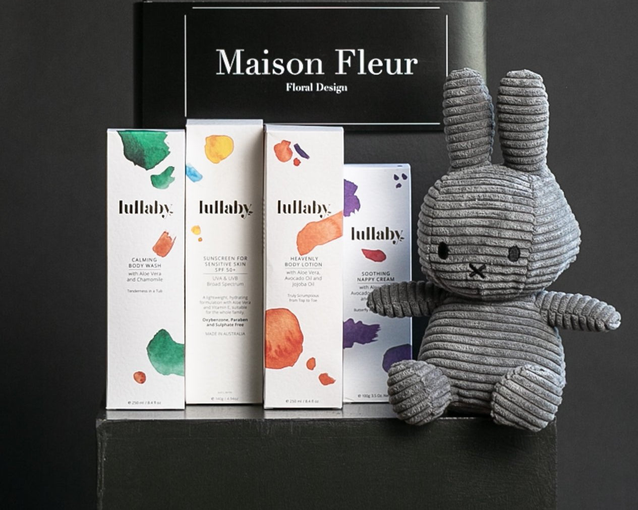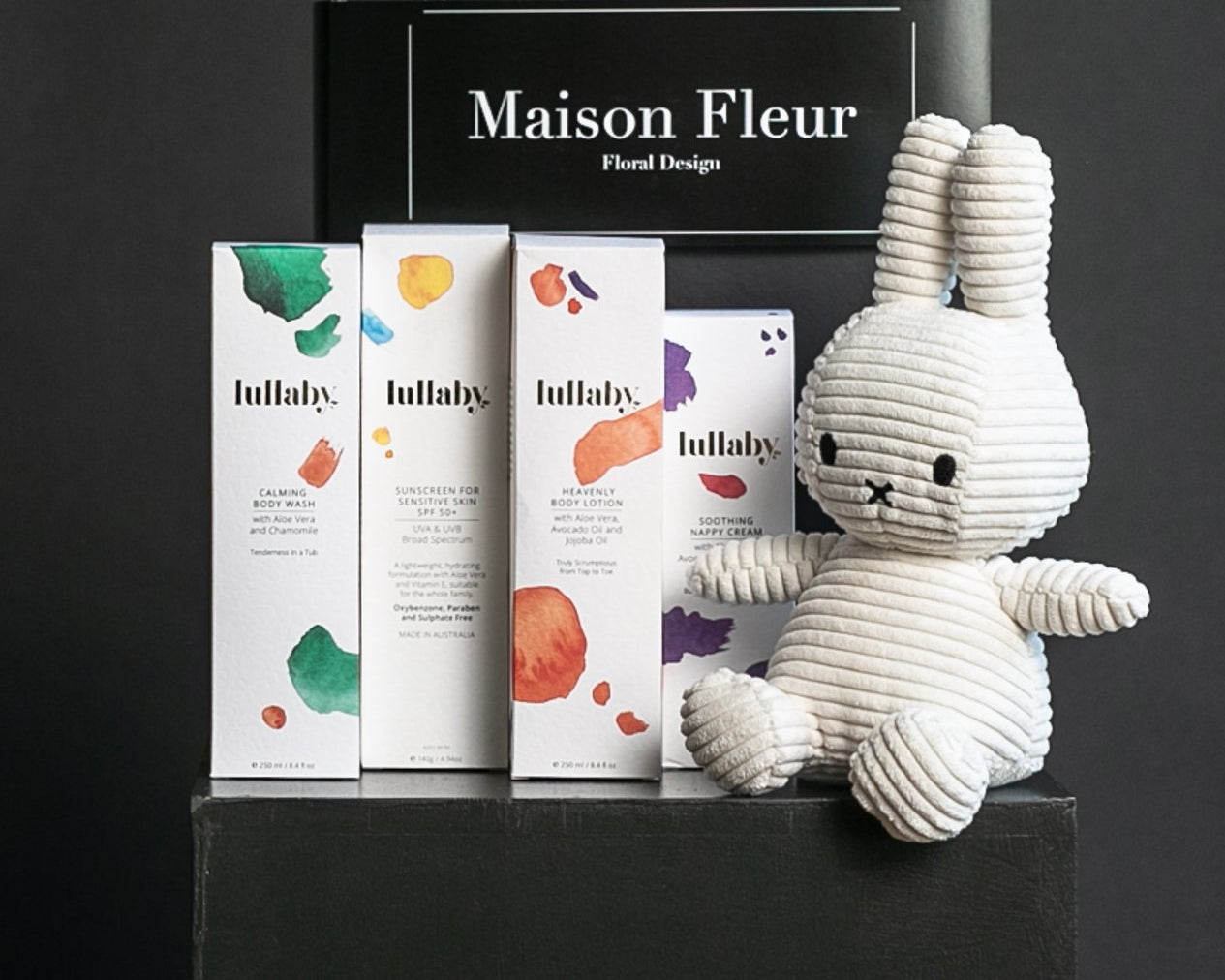 Lullaby Calming Body Wash, Sunscreen for Sensitive Skin SPF 50+, Heavenly Body Lotion, Soothing Nappy Cream and paired either with Miffy White, Miffy Grey or Bella Bunny.