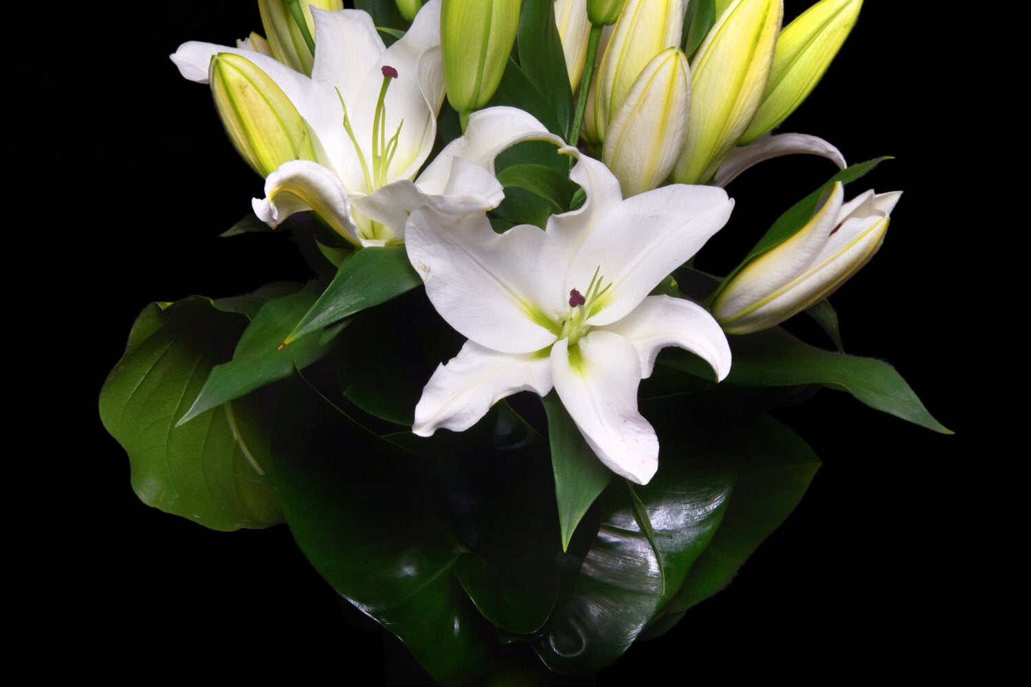 An elegant gift for the office or home, Lily Vase is a timeless design of Oriental Lily and lush tropical foliage presented in a leaf-lined glass vase.