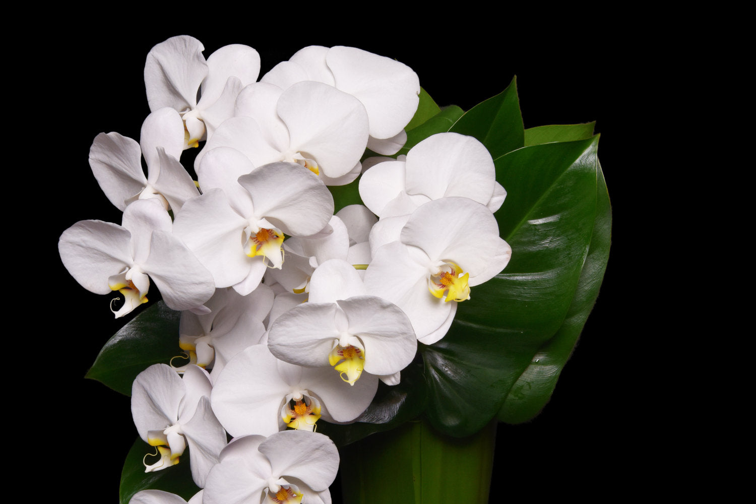 Luxurious and refined, the Maison Fleur Orchid Vase is a premium selection of stunning Phalaenopsis Orchids stems with lush tropical foliage presented in a leaf-lined glass vase. The perfect gift for an engagement, an anniversary or as an expression of sympathy.