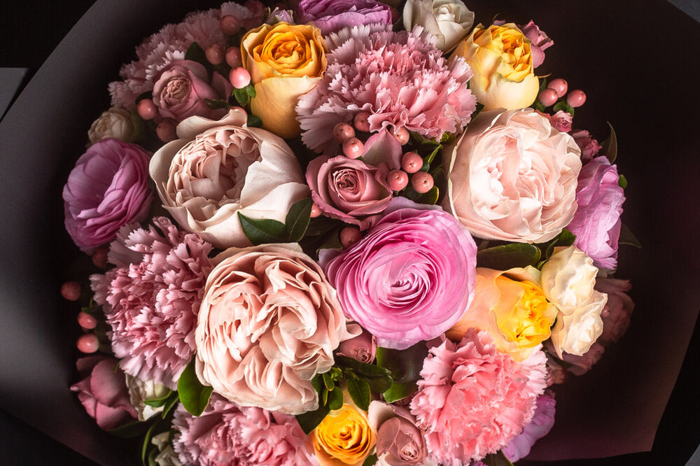 Spring Piccolo from Maison Fleur. A delicate selection of seasonal blooms in elegant Springtime tones, created as a bouquet in a posy style, wrapped in our signature black wrap and finished with our printed Maison Fleur ribbon.
