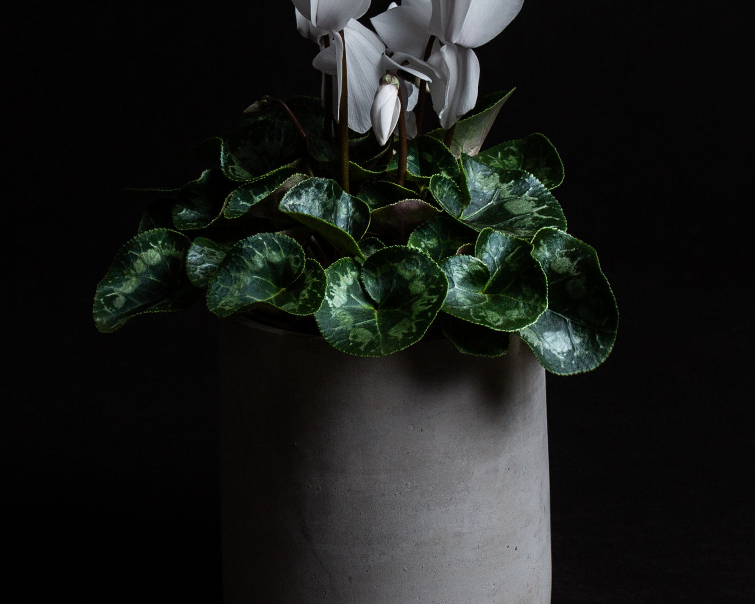 Our elegant Cyclamen plants are presented in a stylish cement pot and wrapped in our signature black wrapping and ribbon.